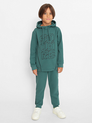 Трикотажный комплект для мальчика, состоит из куртки на молнии с капюшоном и брюк. По низу брючин манжет.