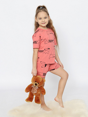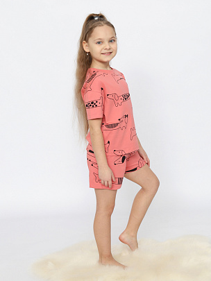 Пижама набивная из футболки и шорт. Футболка оверсайз с коротким рукавом. Горловина обработана притачной бейкой из рибаны с лайкрой. Шорты свободного покроя длиной до середины бедра. Цельнокроеный пояс обработан плоским швом вподгибку с одновременным прокладыванием резинки.
