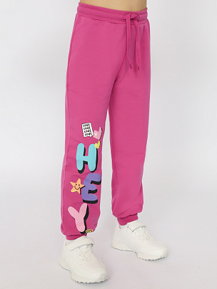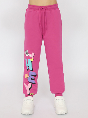 Джемпер для девочки с длинными рукавами. Горловина, рукава и низ изделия с эластичной резинкой. На полочке декоративный принт с блестящим эффектом и надписью - "Улыбнись". Брюки-джоггеры без карманов. Пояс притачной, со вставленной внутрь резинкой. В пояс вставлен шнур. Спереди деворативный принт с блестящим эффектом и надписью - "Привет". Внизу манжеты.
