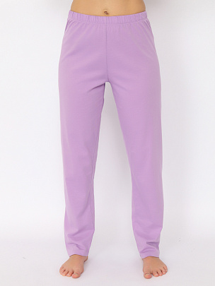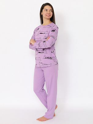 Комбинированная пижама из джемпера и брюк. Джемпер свободного покроя с длинным рукавом, набивной. Горловина обработана притачной бейкой из рибаны с лайкрой. Брюки прямые, умеренного объёма выполнены из гладкокрашеного полотна. Цельнокроенный пояс обработан плоским швом вподгибку с одновременным прокладыванием резинки.