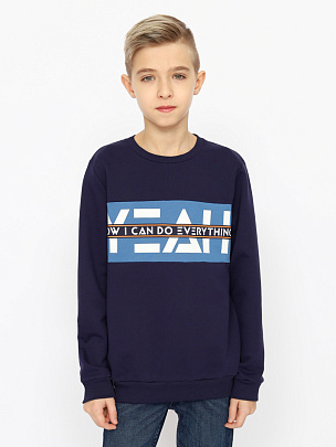 Джемпер для мальчика с длинными рукавами и притачным поясом. Воротник, манжеты и пояс выполнены из полотна с эластаном. Перед и спинка джемпера со вставками контрастного цвета. Вставки декорированы принтами. На пояс спереди настрочена декоративная жаккардовая этикетка.