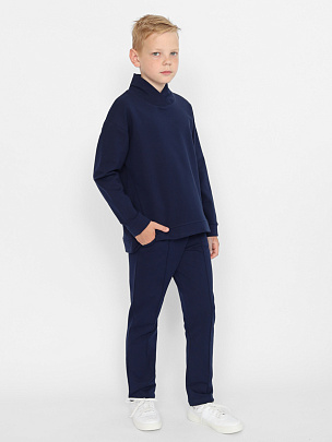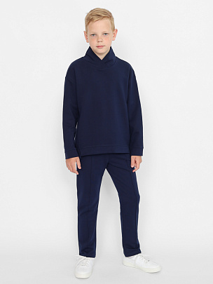 Джемпер для мальчика со спущеным плечом. Рукав втачной с манжетами. Боковые швы джемпера смещены на полочку, низ джемпера обработан поясом с разрезами. Воротник-стойка отложной. Манжеты и пояс выполнены из основного материала.