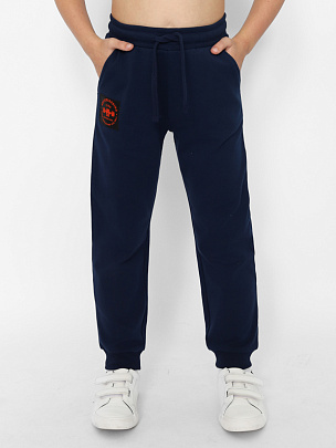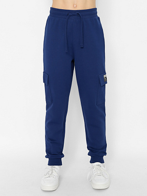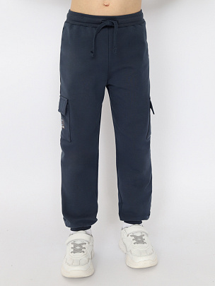 Брюки с притачным поясом и манжетами. В пояс вставлена резинка и функциональный шнур. Пояс и манжеты выполнены из полотна с эластаном. В боковой части брюк располагаются карманы. На передней части в области колена расположен декоративный подрез. На задней части брюк расположена декоративная вставка контрастного цвета. Карман декорирован вязаной нашивкой.