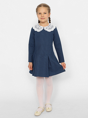Платье для девочки из футера. Изделие с длинными рукавами, отложным съемным воротником из кружева. Отрезное чуть ниже линии талии. Сзади застегивается на пуговку. Декорировано бантиком.