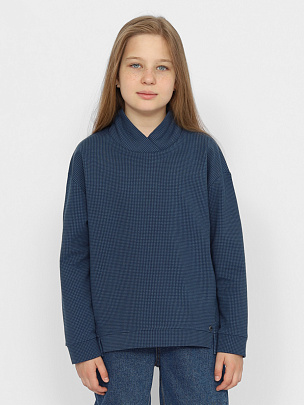 Джемпер свободного силуэта для девочки со спущенным плечом и длинными рукавами. Полочка декорирована принтом с блестящим эффектом. Воротник из основного полотна.