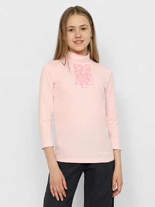 Джемпер-поло из пике для девочки, с длинными объемными рукавами, свободного силуэта, спущенным плечом и отложным воротником. Спереди застежка на пуговицы. Спереди декорирован вышивкой.