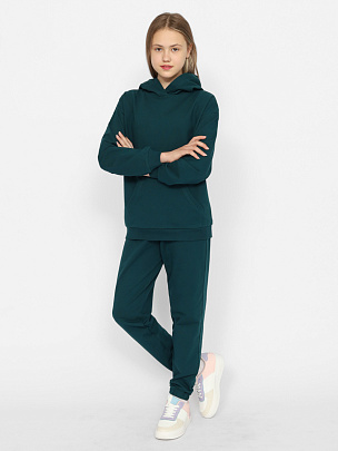 Толстовка с длинными втачными рукавами и манжетами из полотна с добавлением эластана. В нижней части толстовки расположена декоративная планка контрастного цвета. Капюшон с лицевой частью и декоративным принтом, шнурок декорирован вязаной нашивкой. Перед декорирован принтом "Панно" мир динозавров. Брюки с притачным поясом, манжетами и функциональными карманами. Пояс и манжеты выполнены из полотна с эластаном.