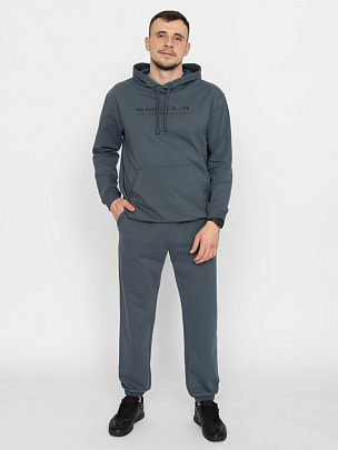 Брюки на манжетах внизу. Отрезной пояс выполнен из основного полотна. В поясе функциональный кругловязаный шнур вставлен в петли. Карманы наклонные в боковых швах. Декорированы жаккардовой этикеткой.