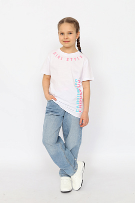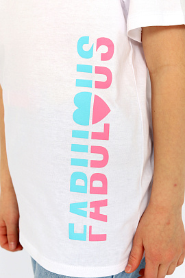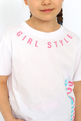 Футболка с коротким рукавом. Горловина круглая, обработана узким воротником из полотна с эластаном. Перед оформлен шрифтовым принтом.